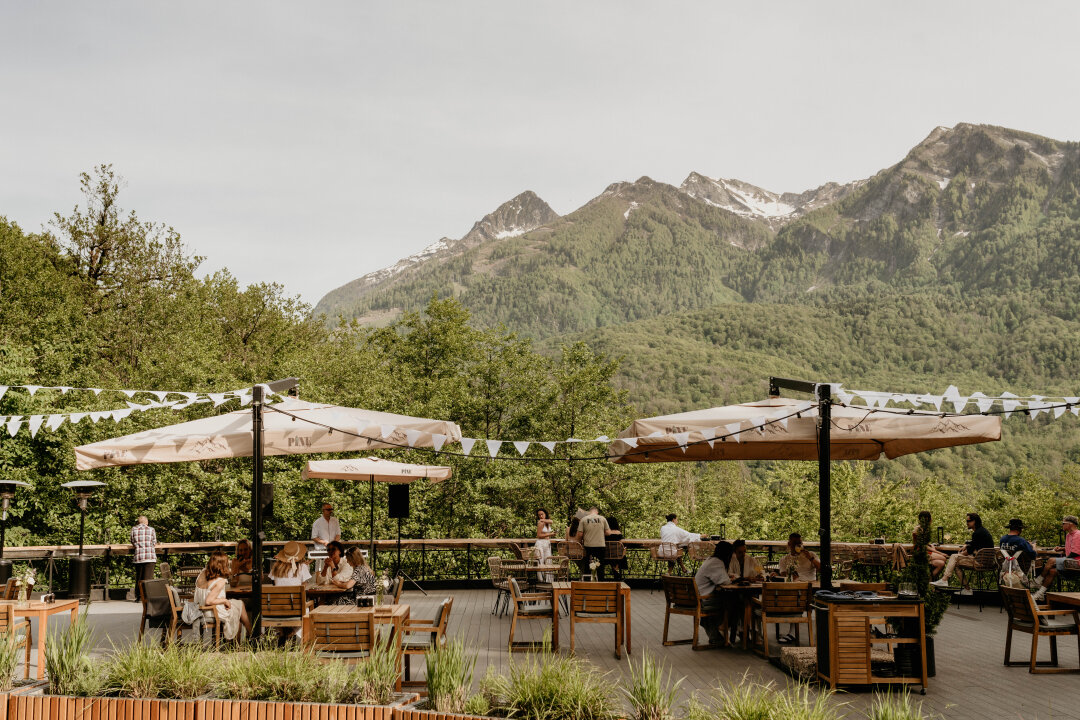 В теплое время года в ресторане работает летняя сверхпанорамная терраса, где гости могут наслаждаться гастрономическими шедеврами на свежем воздухе, окруженные потрясающими видами. В каждое время года своё настроение: заснеженные склоны, лёгкий туман, облака, плывущие на уровне глаз, горы, утопающие в золоте осени или зелени лета.